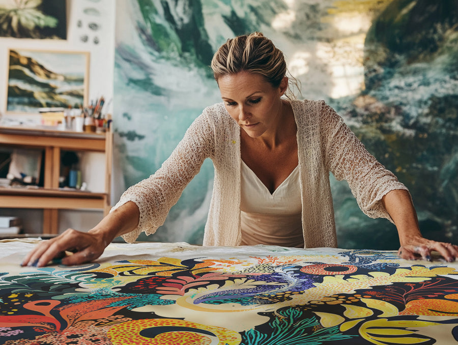 Com uma trajetória marcada pela busca da conexão entre arte e natureza, seu processo criativo é profundamente intuitivo, quase meditativo — guiado por ritmos naturais e pela observação do universo submerso.