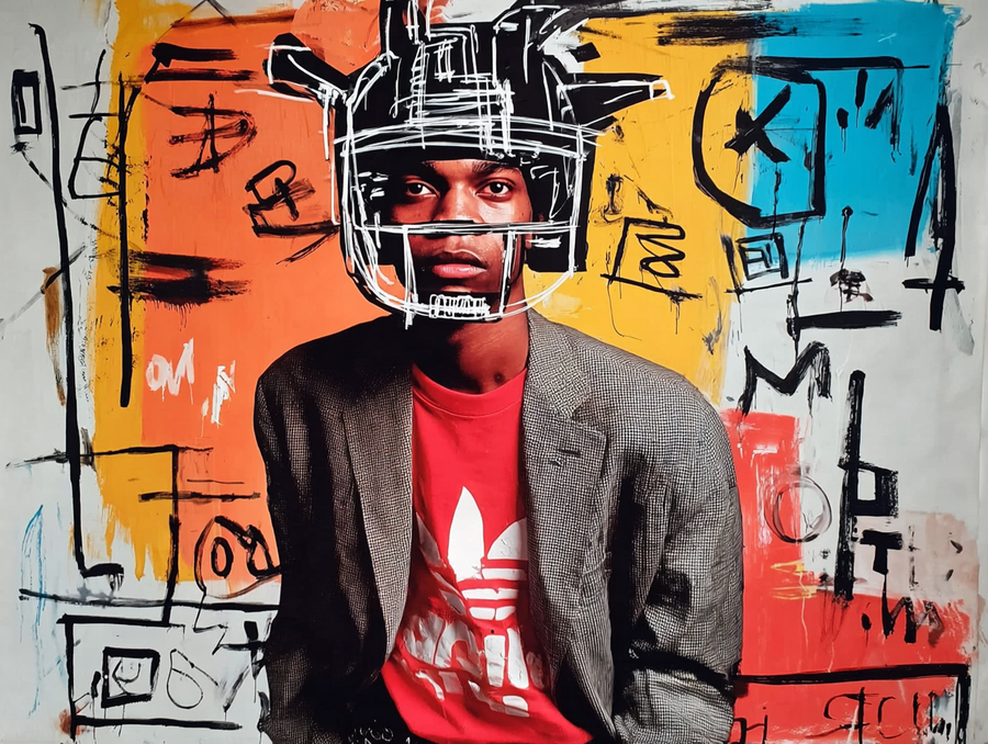PROMPT: An afro-american man wearing an adidas t-shirt and blazer, with graffiti in the style of jean-michel basquiat in the background. the character is wearing a football helmet made of metal in front of his head. the figure has very short hair. --ar 4:3