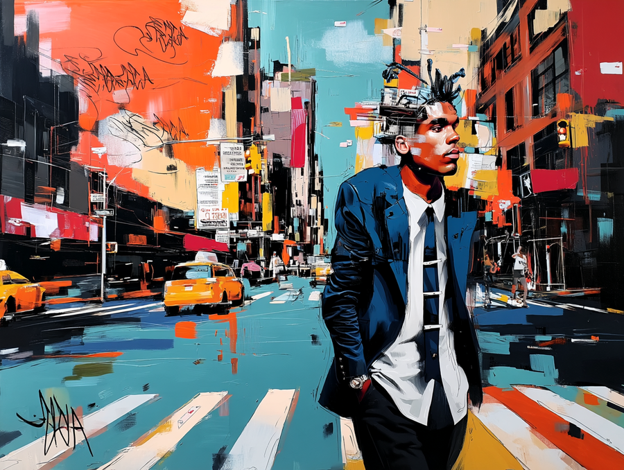 ChatGPT 5.1: Malik Hayes é um artista afro-americano cujo trabalho resgata e reinventa o espírito vibrante do neo-expressionismo. Nascido em Nova York, Malik cresceu imerso na efervescência cultural do Brooklyn, absorvendo influências do grafite e da cultura hip-hop. Seu estilo dialoga com a energia caótica e visceral de Jean-Michel Basquiat, combinando gestos impulsivos, texturas marcantes e um jogo entre palavras, ícones e figuras abstratas.