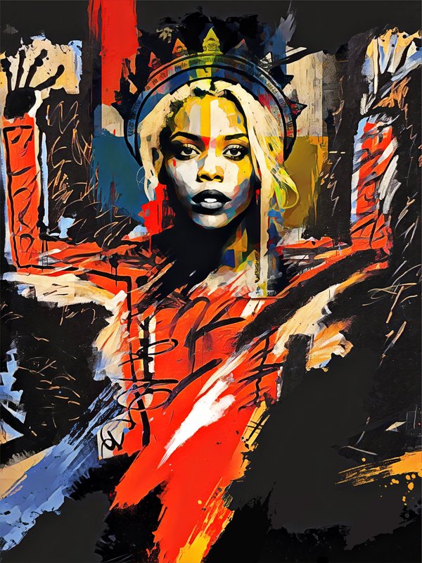 Basq Girl 1 é um quadro que criado a partir da técnica mista de combinação de elementos. As pinceladas abstratas e o estilo neoexpressionista criam um contraste visual na figura feminina.