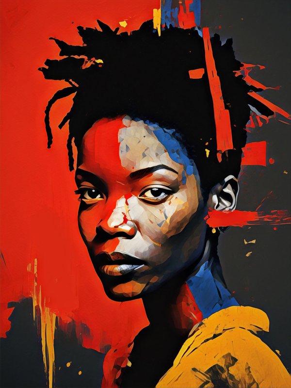 Basq Girl 2 combina diferentes traços para destacar o retrato da figura feminina. As cores vermelho, amarelo e azul compõe o quadro em coerência estética ao trabalho do artista neoexpressionista.