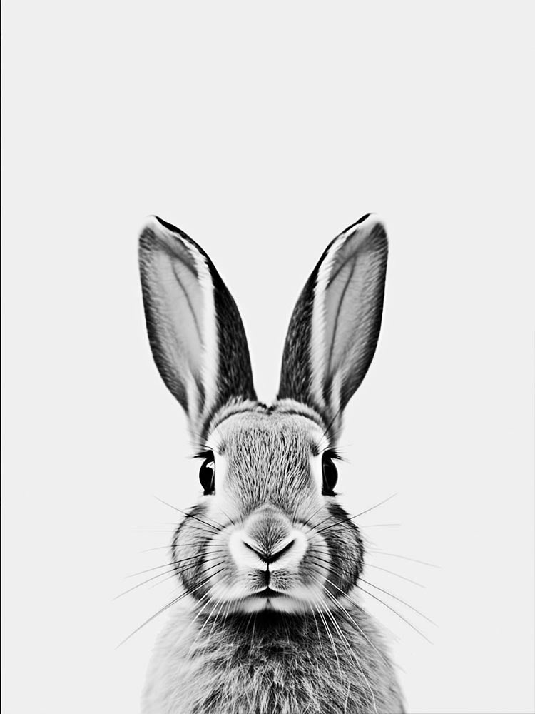 Impressionante retrato em preto e branco que revela cada detalhe fascinante deste coelho. A ausência de cor intensifica a riqueza dos detalhes, criando um jogo de luz e sombra que destaca a força e elegância natural deste animal.