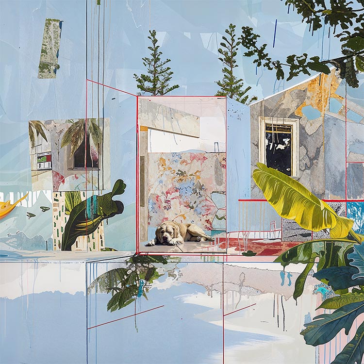 A pintura "Dog Relax" traz uma vibe floral e tropical com a leveza do verão e do clima de praia. O destaque fica por conta do cachorro relaxando ao lado da porta, trazendo um toque acolhedor e tranquilo à cena. Perfeita para quem quer adicionar um pouco de frescor e sossego pra dentro de casa.