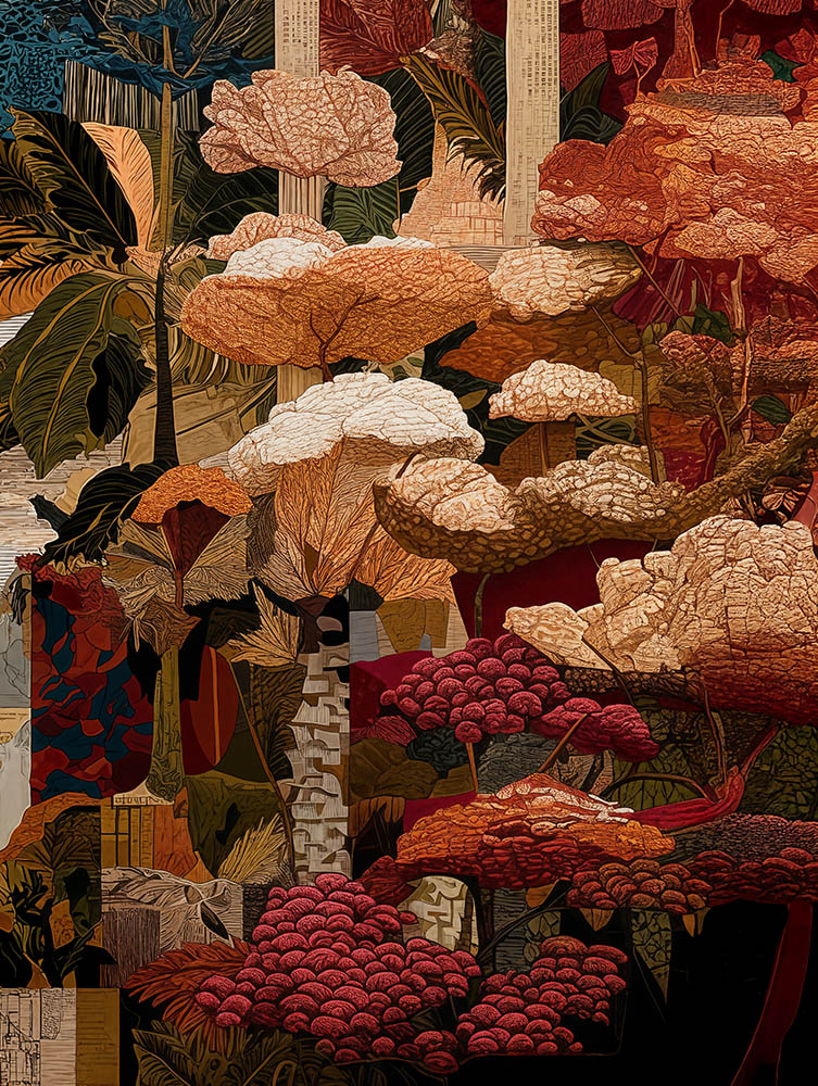 Floresta Bordada B é uma pintura que captura os detalhes e a textura de um grande bordado. Com detalhes minuciosos que remetem a pontos e fios entrelaçados, a obra traz a floresta para a vida de forma única e artesanal.