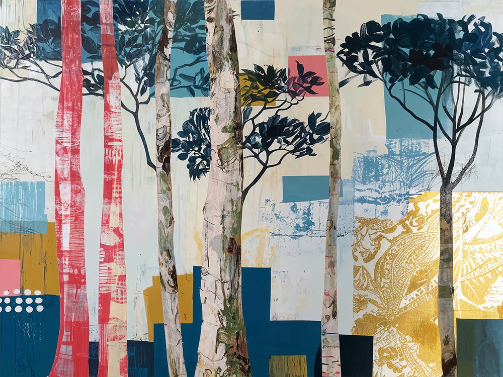 Esta obra traz a energia da floresta com cores vibrantes e texturas marcantes e douradas que dão vida à pintura. Com um toque abstrato, ela convida você a sentir a natureza de uma forma única e cheia de personalidade.