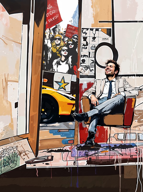 O quadro decorativo "Heroico A" mostra um homem de terno sentado ao lado de um carro de luxo, com uma manifestação ao fundo. A obra faz refletir sobre o consumo, trazendo uma mensagem sobre a atualidade.