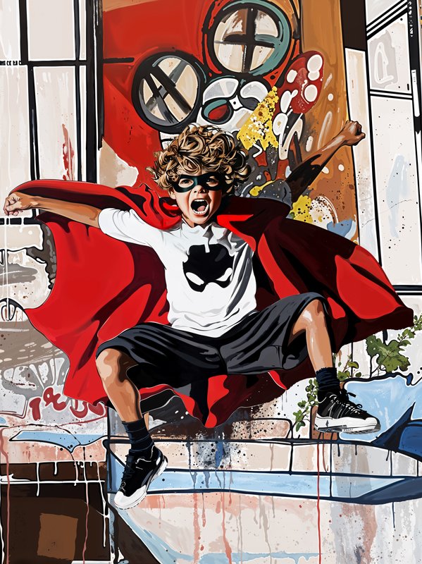 O quadro decorativo "Heroico B" traz a ilustração animada de uma criança usando máscara de super-herói, voando e cheio de energia, perfeito para dar vida e diversão a qualquer ambiente.