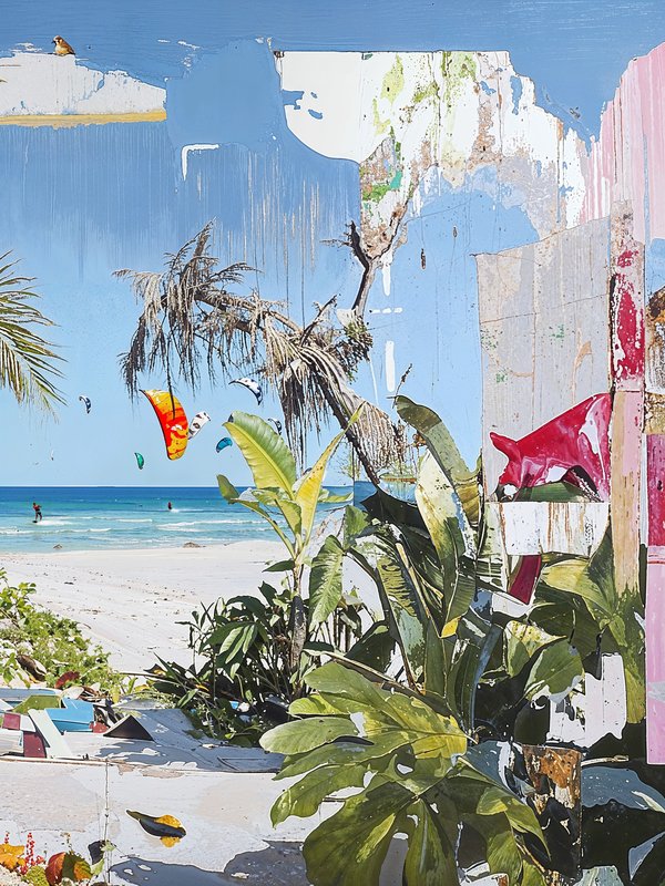 Descubra a energia vibrante do Kite Garden 8C, onde kitesurfistas deslizam sobre as águas cristalinas da Praia do Preá. Este quadro combina elementos florais coloridos com a emoção do kitesurf.