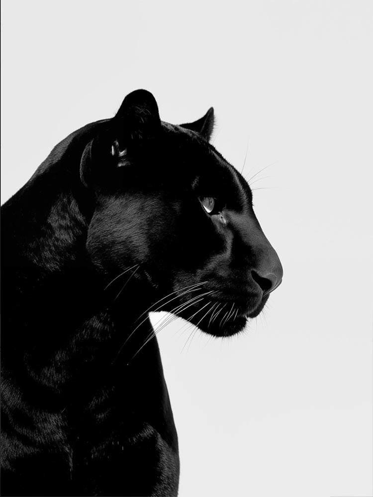 Impressionante retrato em preto e branco que revela cada detalhe fascinante desta pantera negra. A ausência de cor intensifica a riqueza dos detalhes, criando um jogo de luz e sombra que destaca a força e elegância natural deste animal.