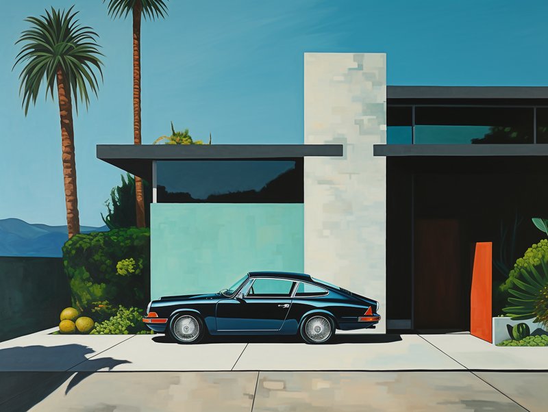 Este quadro exibe uma elegante residência com um automóvel clássico em primeiro plano. Com palmeiras e relevo montanhoso ao fundo, Modern House with Car 2 traz um ar de glamour inspirado na Hollywood antiga.