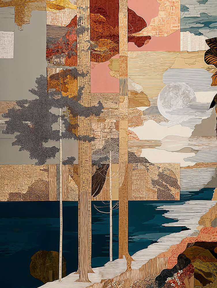 Floresta Bordada A é uma pintura que captura os detalhes e a textura de um grande bordado. Com detalhes minuciosos que remetem a pontos e fios entrelaçados, a obra traz a floresta para a vida de forma única e artesanal.