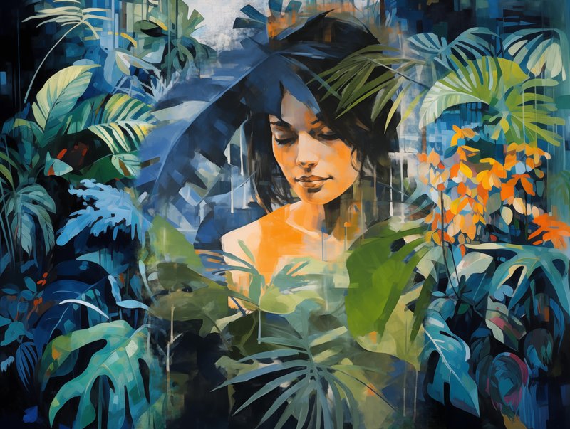 "Tropicana", obra que captura a essência vibrante da floresta tropical. Com cores intensas e vivas, esta peça traz para seu espaço a energia e a diversidade da natureza tropical. Perfeita para quem busca adicionar um toque de vida e natureza à decoração.