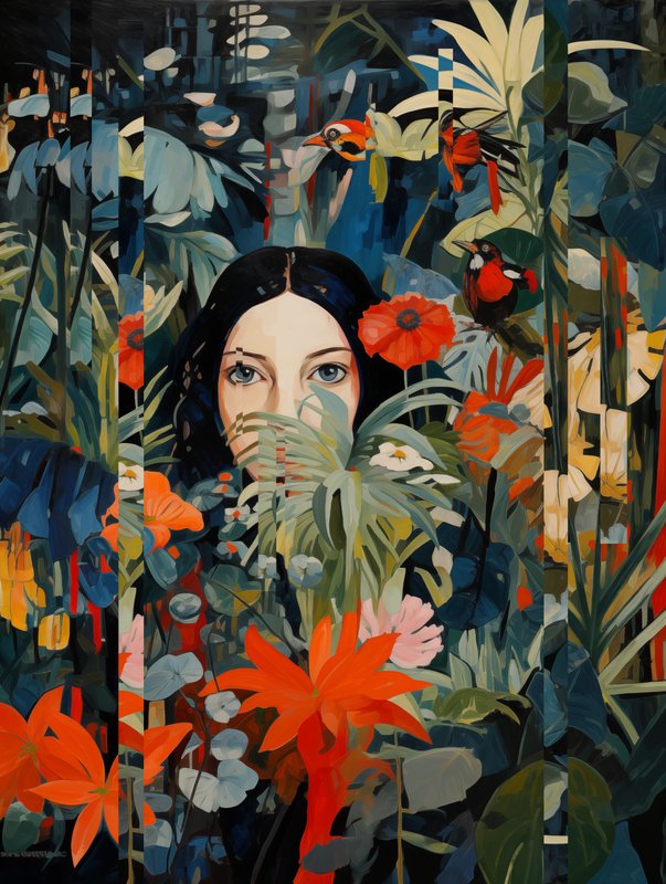 A "Tropicana 9A" traz uma composição fascinante de uma mulher de olhar penetrante, envolta pela exuberância da mata tropical. As cores vibrantes contrastam com a intensidade de sua expressão, enquanto ela parece fundir-se com a natureza ao seu redor.