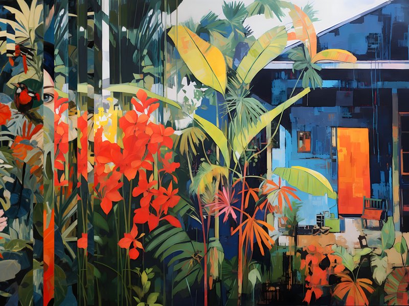 Descubra a magia de "Tropicana 9B", uma obra que transporta você para uma casa aconchegante escondida na exuberante floresta tropical da Costa Rica. As cores vibrantes capturam a energia da natureza selvagem. Um pedaço do paraíso tropical para sua decoração.