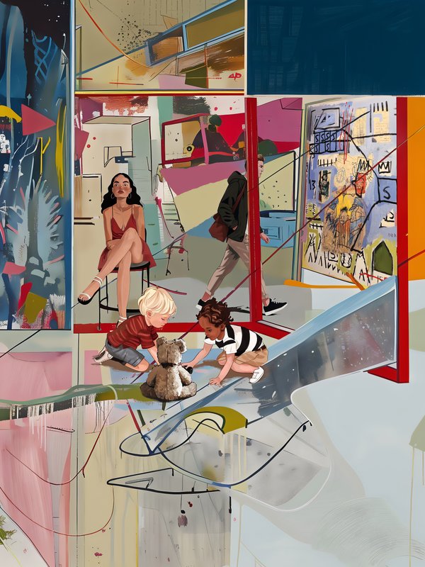 Um olhar íntimo sobre o cotidiano familiar, onde uma mãe contempla com ternura suas crianças brincando no chão. Enquanto os pequenos se perdem em seu mundo de imaginação, a mãe observa com um misto de alegria e nostalgia, consciente da rapidez com que esses instantes passam. Uma obra que celebra os momentos simples que formam as memórias mais duradouras.