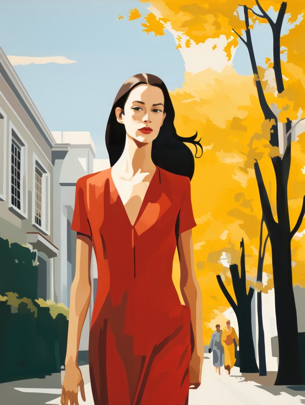 Woman in Red Dress 1 retrata a cena de uma mulher caminhando pela rua, contrastando com uma árvore de tons amarelos ao fundo. A composição artística captura um momento simples, mas cheio de charme do cotidiano.